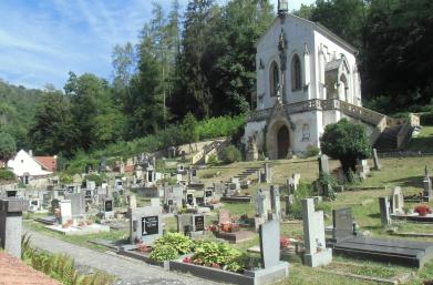 Friedhof mit der markanten neu-gotischen Kapelle. Vom Ort aus gibt
